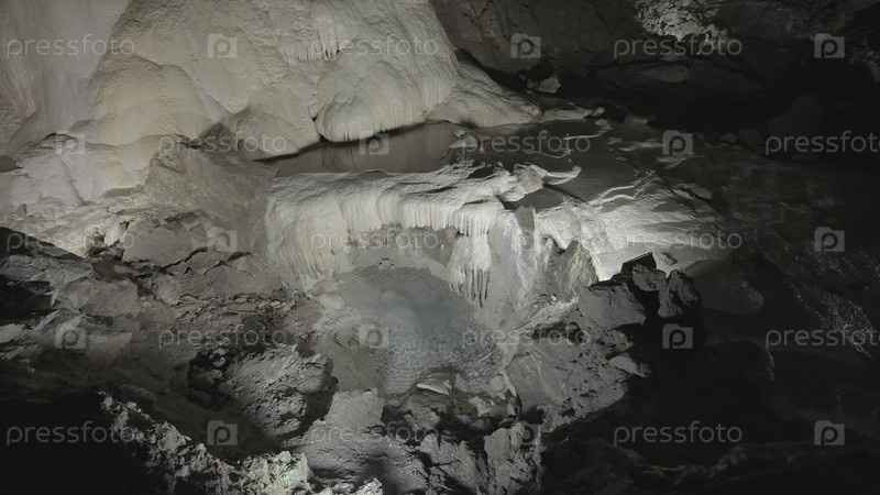 Пещерная формация. Идите дальше. Красивые стены освещенной пещеры с образованиями. Сталактиты и сталагмиты в пещерных залах