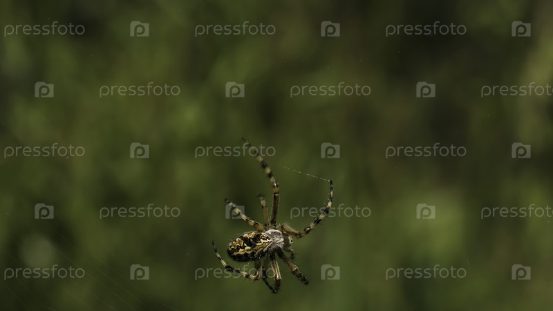 Большой паук ползает по своей паутине и перемещает большие листья и маленькие камни в траве