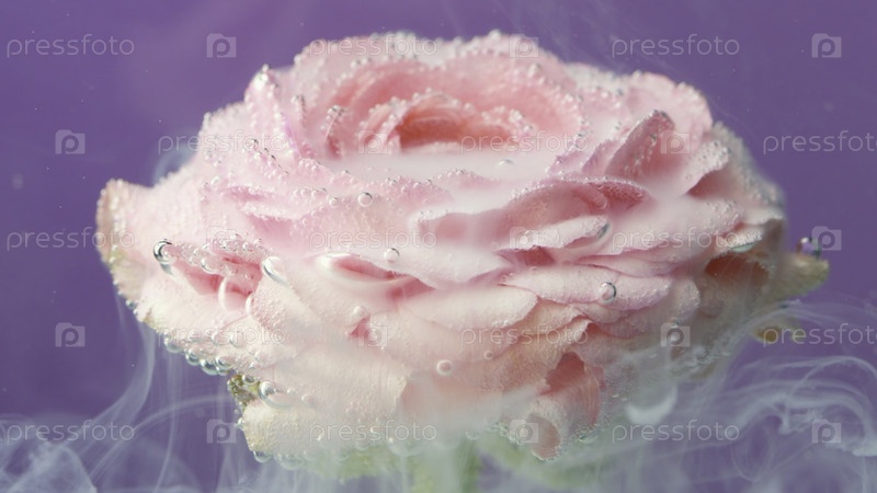 Нежный фиолетовый фон. резервные кадры. Красивая творческая работа, где медленно высвобождается пар и капли разливаются на розовый цветок