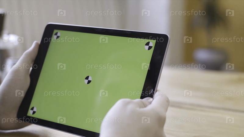 Технологии, макет и концепция Интернета, хромовый ключ для размещения собственного контента.Молодая женщина смотрит на планшетный компьютер с зеленым экраном