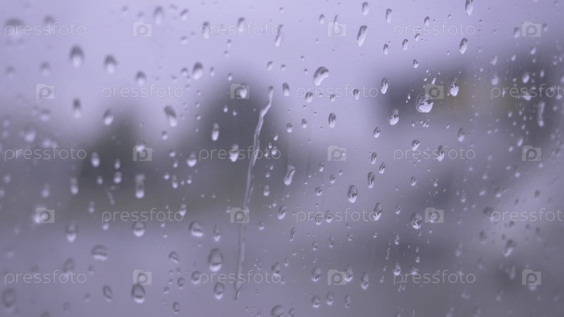 Стекло мокрое, капли дождя на влажном стекле окна, осенний дождливый пейзаж размыт