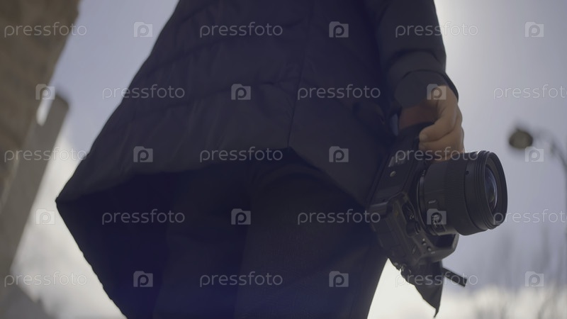 Фотограф держит в руках профессиональную камеру. Продолжайте. Камера находится в руках молодого профессионального фотографа. Женщина, сфотографированная на фотоаппарат