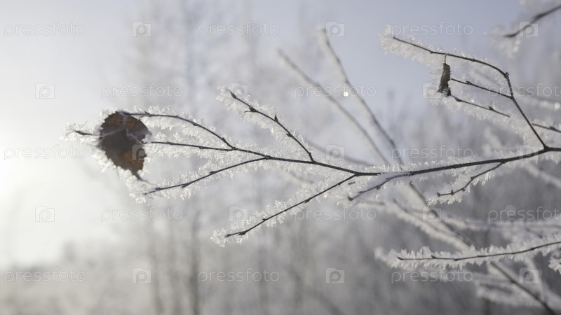 Снежный лес. Творческий. Сухие ветви, на которых красиво лежит снег и есть высохшие листья на фоне белого снега в лесу. Высококачественные кадры 4k