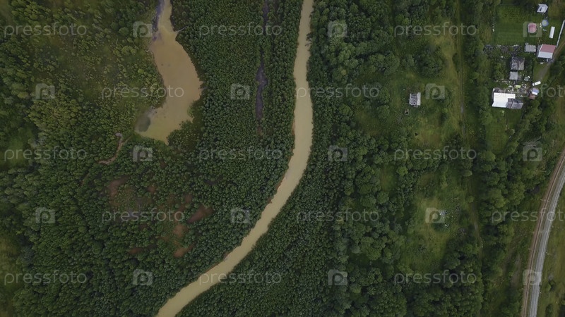 Грязная река в лесу. Вид с дронов. Клип. На заднем плане вы можете увидеть огромную изогнутую грязную реку с нефтепродуктами, которая течет рядом с огромным зеленым лесом и несколькими маленькими домами для людей