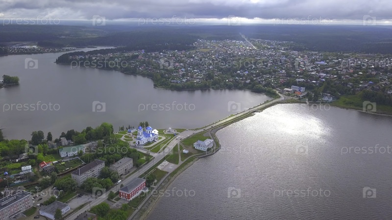 Вид на город с рекой и плотиной. Клип. Два берега большой реки соединены дамбой с дорогой. Красивый пейзаж в городе разделен большой рекой и связан дорогой на плотине