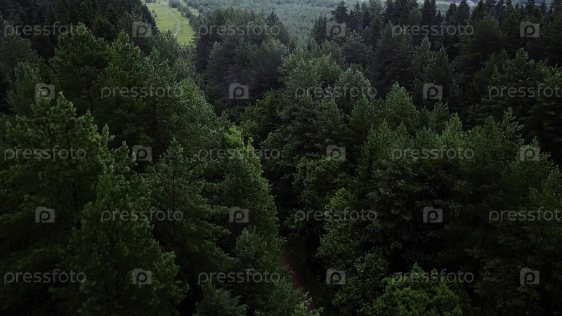 Очень много зеленых деревьев. Клип. Вид с высоты птичьего полета на ель и сосны со свежими зелёными ветвями