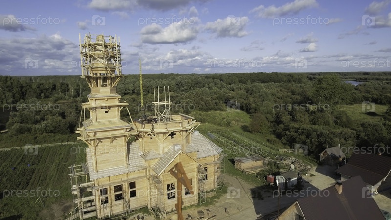 Вид сверху на строительство деревянного здания с башней. Резервные кадры. Строительство или реставрация старой русской деревянной церкви. Строительство деревянного храма на фоне летнего леса