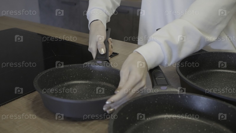 Женщина держит современную кастрюлю для жарки.Давайте.Закрывая женщину, рекламирующую новые сковородки.Женщина снимает ручку из кастрюли