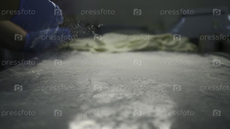 Замыкание муки и опрыскивание во время приготовления пищи. Клип. Кухарь поливает мукой на кухонном столе. Посыпать муку для выпечки. Производственная пекарня