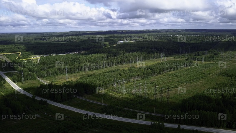 Зелёный лес вокруг реки с растениями, трубами и белыми облаками