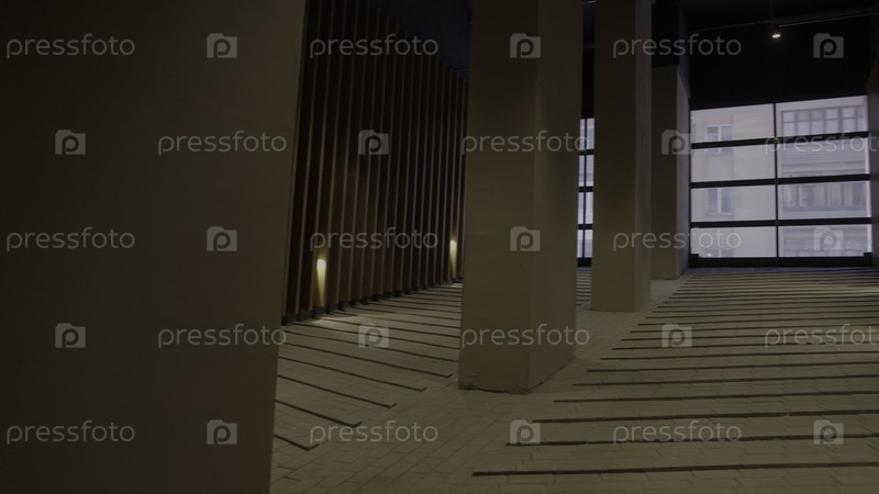Яркий коридор. резервные кадры. большие колонны и окна в офисном здании. высококачественная 4k запись
