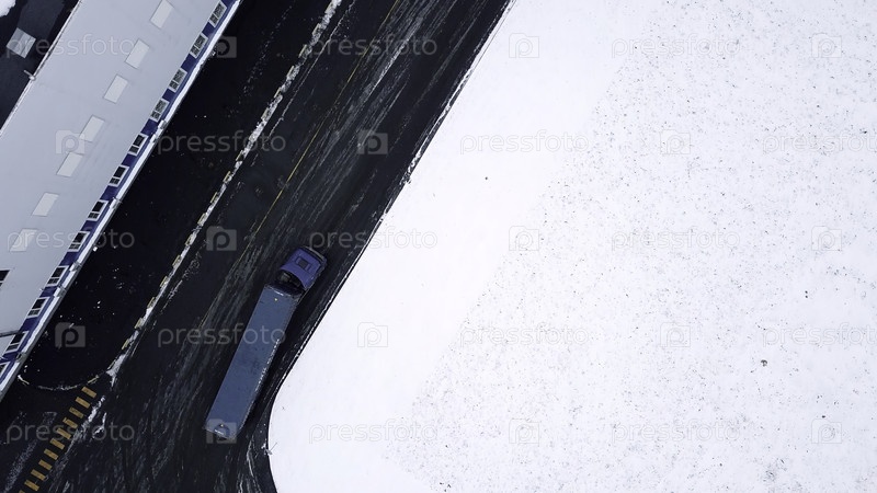 Гигантский синий грузовик движется. Вид с высоты птичьего полёта. Креативность. Зимний пейзаж, где большая машина несет груз. Высококачественный 4k кадры