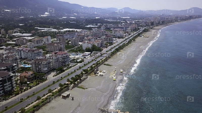 Вид на побережье океана, рядом с которым ездят машины. Клип. Вид с высоты пляжа рядом с которым видна дорога с движением транспортных средств и жилых зданий. Высококачественная запись 4k