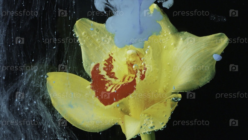 Красивый цветок в воде с чернилами. Резервные кадры. Плеск чернил со ярким цветком в воде. Чернила мягко обворачивают зародыш под водой