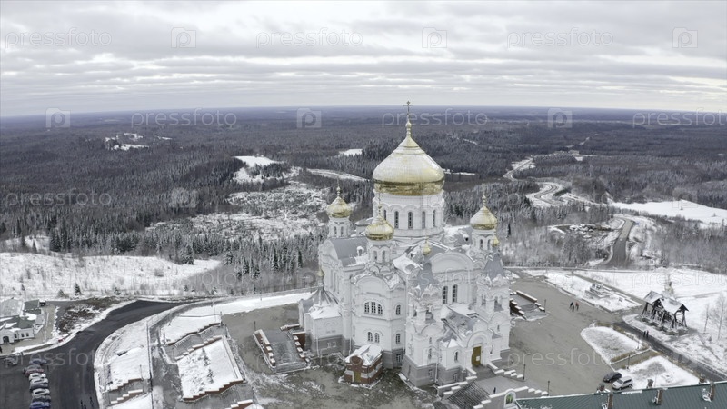 Вид на белую церковь с золотыми куполами зимой. Прекрасный пейзаж церкви на горе на фоне зимних лесов. Церковь со золотыми куполами на холме на фоне горизонта с лесом зимой
