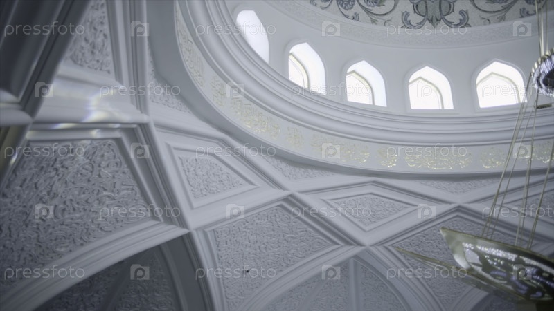 Казань, Россия - 2 мая 2022: Красивые белые узоры мечети. Сцена. Детали интерьера белой мечети. Открытые узоры на мраморных стенах храма или мечети. Белая мечеть Иреки в Казани