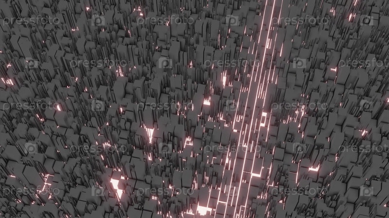 Иллюминированная абстракция. Дизайн. Черные линии, вдоль которых проходят зеленые и красные лучи начинают светить и излучать эти цвета