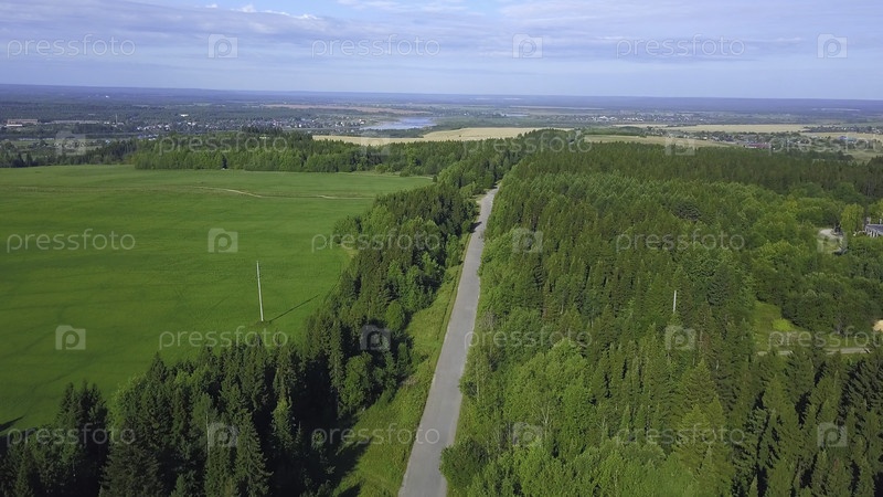 Вид на живописные зеленые леса с дорогой и горизонтом. Клип. Дорога, проходящая через зелёный лес против города на горизонте. Панорама лесного маршрута с горизонтом в солнечный летний день