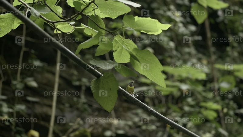 Маленькая птичка на ветке дерева летом. творческая. красивая желтая птица сидит на ветви в зеленом лесу. прекрасная жёлтая птица в лесу. флора и фауна леса