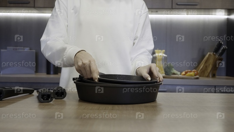 Закройте руки женщины, показывая новые кастрюли, установленные на кухне с съемной ручкой