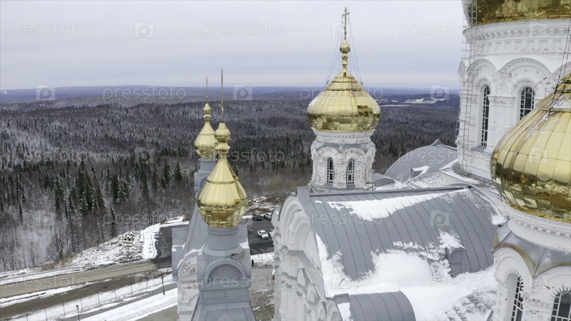 Вид на белую церковь с золотыми куполами зимой. Прекрасный пейзаж церкви на горе на фоне зимних лесов. Церковь со золотыми куполами на холме на фоне горизонта с лесом зимой