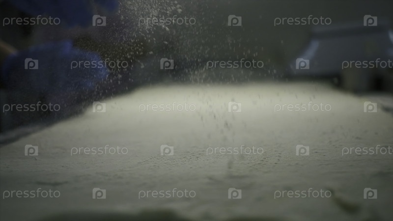 Замыкание муки и опрыскивание во время приготовления пищи. Клип. Кухарь поливает мукой на кухонном столе. Посыпать муку для выпечки. Производственная пекарня