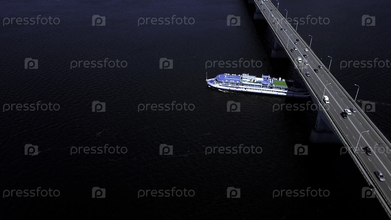 Вид с высоты птичьего полета. Клип. Огромный мост через океан виден для движения автомобилей в разных направлениях и проходящих мимо лодок и кораблей. Высококачественная запись 4k