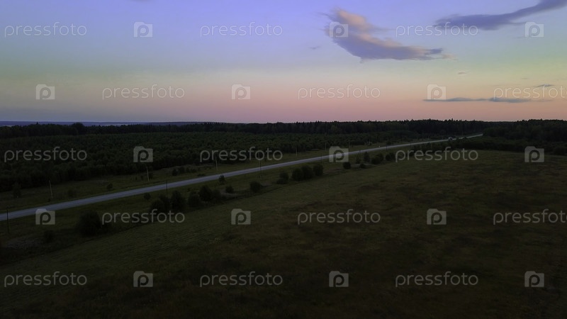 Вид с высоты на красочное живописное небо с дорогой. Клип. пейзаж, где можно увидеть дорогу с автомобилями и большими зелеными полями