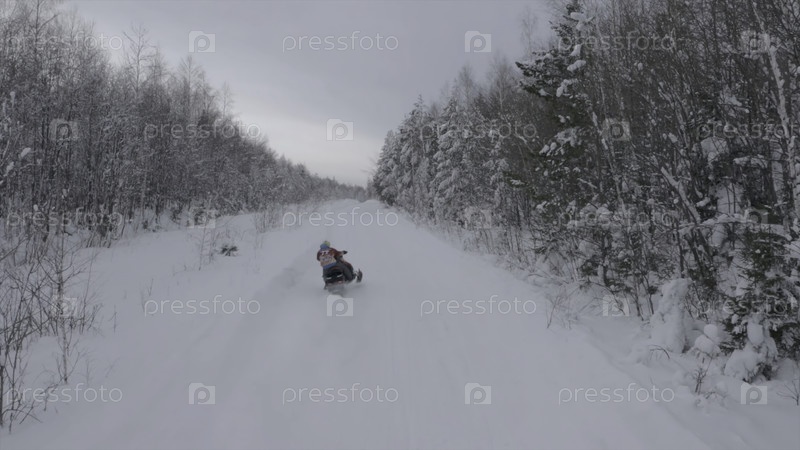 Снегоход на автомагистрали зимнего леса. Красивая зимняя дорога для экстремального вождения снегоходом. Экстремальные виды спорта зимой