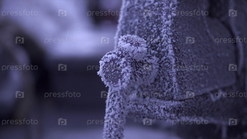 Замороженный механизм зимой. Клип. Большие промышленные части покрыты морозом в зимний день. Часть промышленных или транспортных машин заморожена