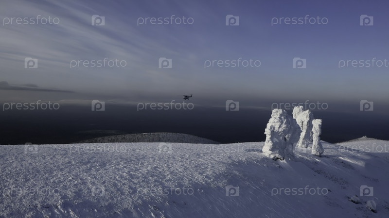 Огромные снежные кучи с большими снежными горами и летающий вертолет видны на фоне синего неба
