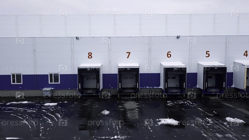 Большие гаража.Креативный вид с вертолета на парковочные места для больших грузовиков с кузовами