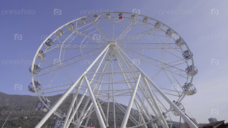 Большое колесо в парке развлечений днем. идите дальше. нижний вид белой романтической привлекательности против голубого неба