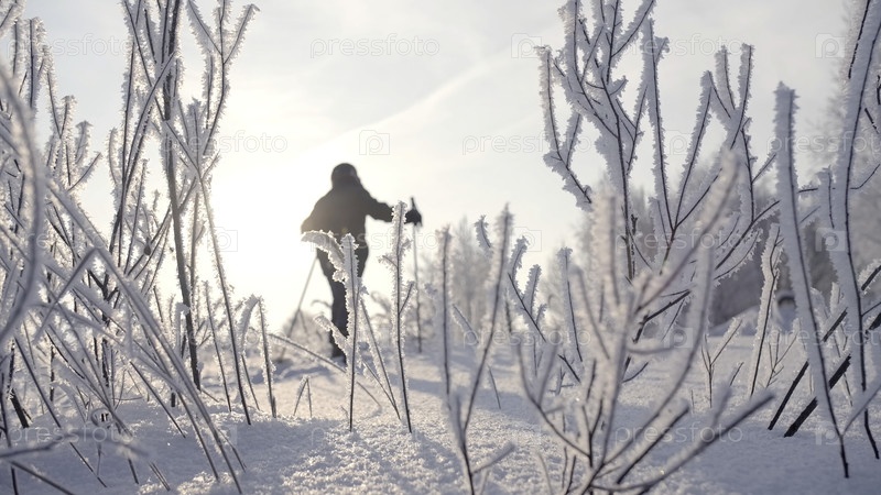Человек, практикующий скандинавскую ходьбу в зимнем лесу.Креативно.Человек, идущий по зимнему снегу в лесу рядом со заснеженными деревьями на фоне яркого солнца и голубого неба.Высококачественные 4k кадры