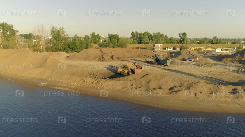 Экскаватор и тяжелый транспорт очищают пляж.Сцена.Уборка или подготовка к строительству пляжа для работы.Экскаваторы и самосвалы работают на песчаном пляже