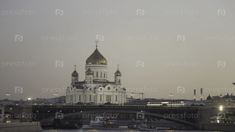 Вид с воздуха на красивое старое здание собора и Московскую реку на фоне захода солнца. Продолжайте. Большие церкви с золотыми куполами и мостом, концепция архитектуры