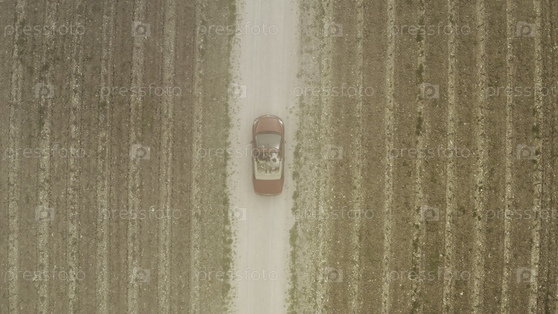 Пустынное поле с кустарниками и дорогой, по которой идет иностранная машина, а за туманом можно увидеть город