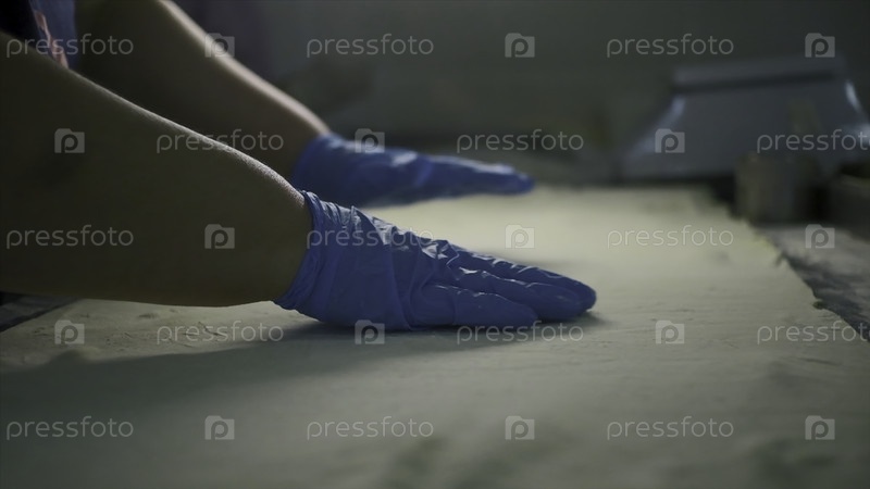 Закрытие приготовления пищи тонким тестом. Клип. Тонкое, большое тесто для готовки. Женщина растягивает тонкое тесто. Промышленная пекарня