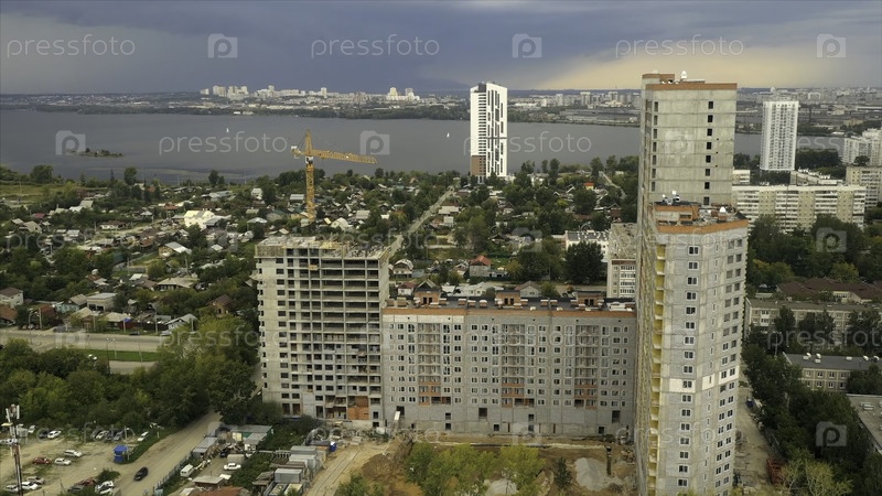 ландшафт дрона. резервные кадры. прекрасный вид на город с высокими домами и большим озером рядом, а также серое небо над головой. высококачественная запись 4k