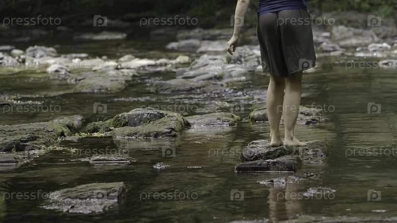Девушка в толстых шортах на природе.Креативная.Молодая женщина прыгает с камня через ручей в джунглях