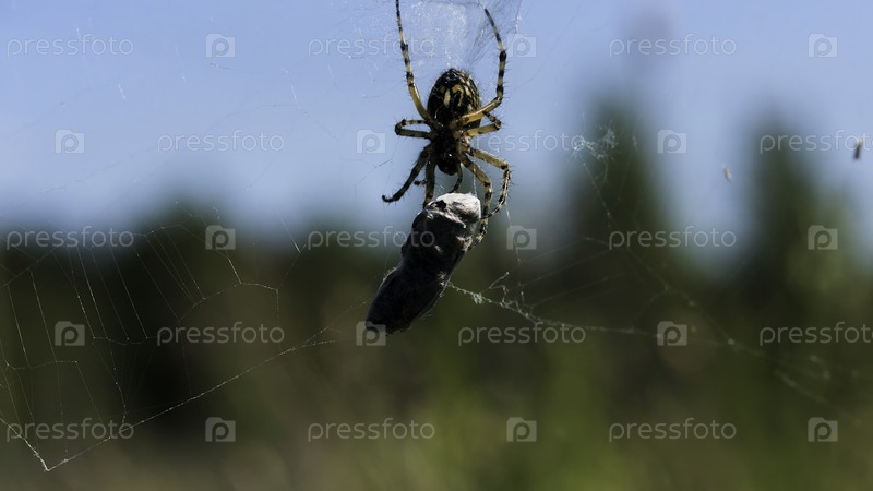 Насекомое висит на паутине.Креативно.Тарантула с тонкими ногами ползает и прикасается к камню, который висит на паутине