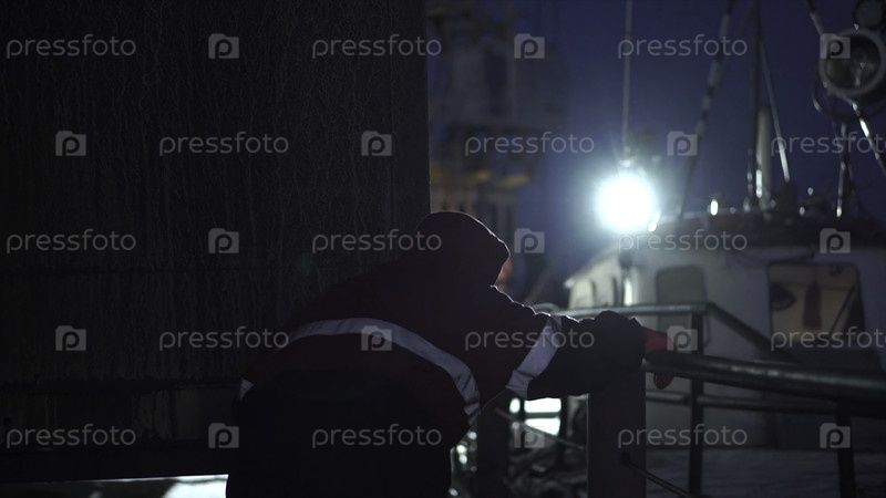 Торговое судно в ночном порту.Клип.Человек на корабле среди портовых огней ночью.Прибытие в ночной торговый порт