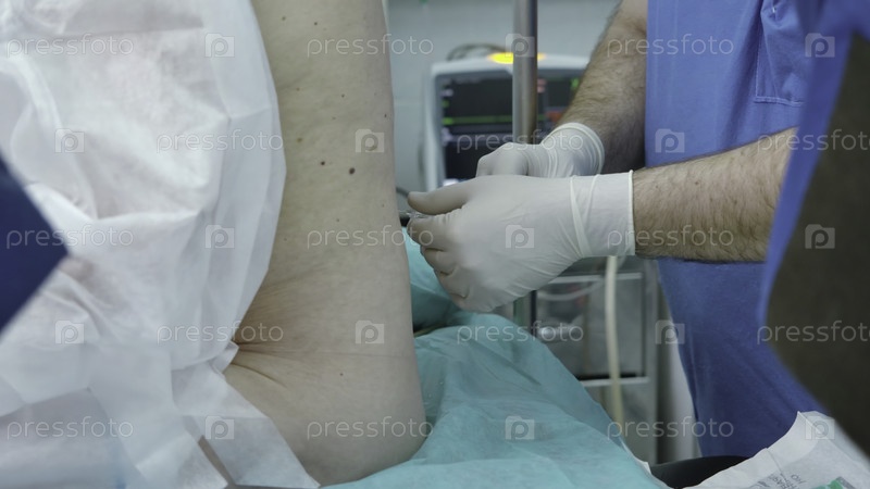 Хирург готовит пациента к операции.Креативность.Пациент сидит спиной к хирургу во время операции.Хирургические приготовления и операции