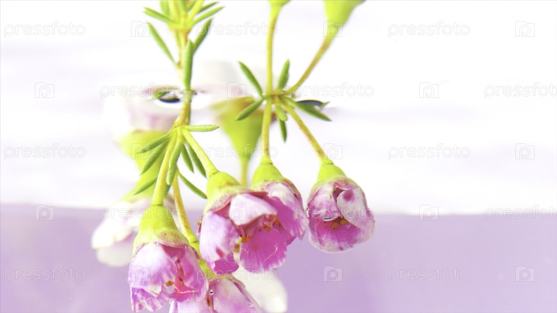 Зеркальное отражение цветов под водой. Резервные кадры. Красивый букет цветов погружен в чистую воду. Подводный вид цветков и отражение на поверхности воды