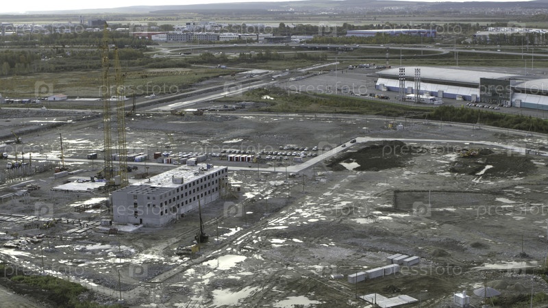 Грязевой вид на стройплощадке. Резервные кадры. Строительные работы в пригороде летом. Строительство зданий в пригороде на горизонте