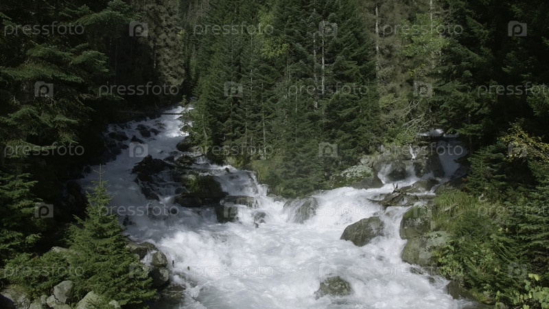 Разветвленные ручьи горной реки в зеленом лесу. творческие. красивый пейзаж с речными потоками на склоне горы с густым зелёным лесом. быстрые речные течения в зеленый лес в солнечный летний день