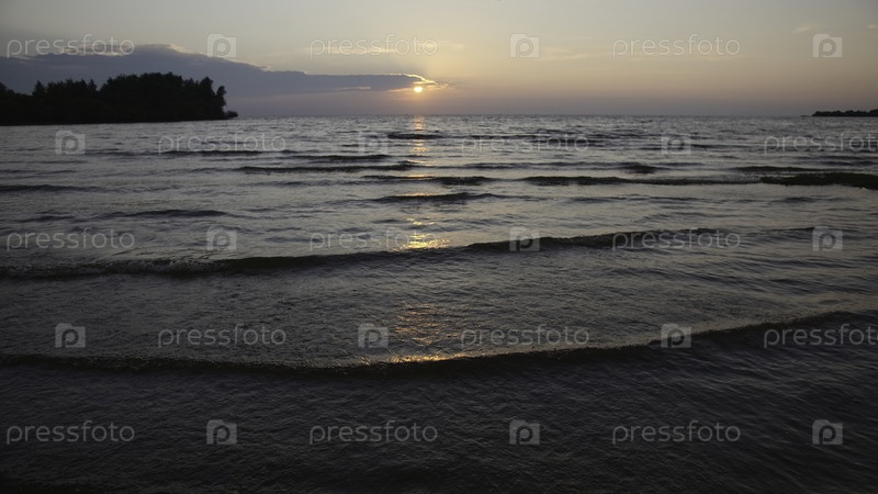 Красивый пейзаж с небольшими волнами и морским закатом.Креативный.Волны в мелководье с заходом солнца на горизонте.Вид с пляжа на прекрасный закат с маленькими волнами