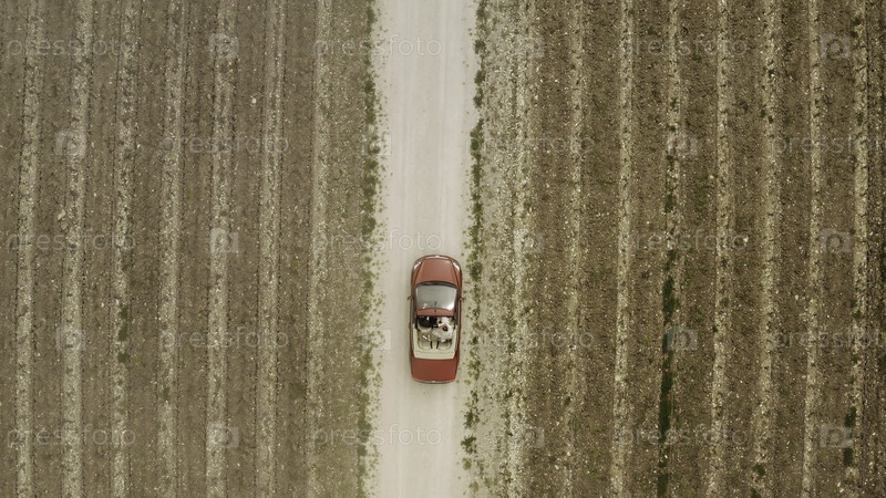 Пустынное поле с кустарниками и дорогой, по которой идет иностранная машина, а за туманом можно увидеть город