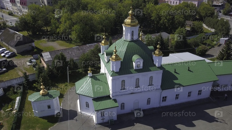 Красивая белая церковь с зеленой крышей и золотыми куполами Зеленая христианская церковь на холме возле деревни летом