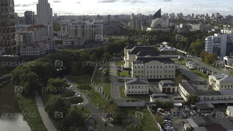 Екатеринбург, Россия - 23 мая 2022: Вид на красивый город с парковой зоной и рекой. Резервные кадры. Пейзаж зеленого города с прекрасной архитектурой и современными зданиями. Парк и река в городе летом